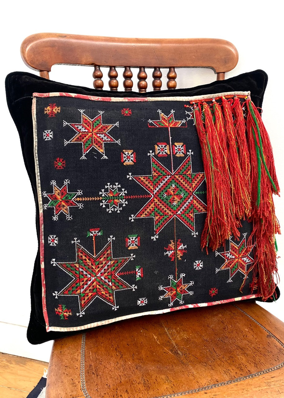 This velvet pillow displays and original vintage Vietnamese hand-woven textile, originally used as a head-piece for one of the Northern Vietnamese indigenous cultures. No longer used, these were discarded or sold. Respectfully, Tamaryn Design returns them to useful objects, to be preserved and admired.